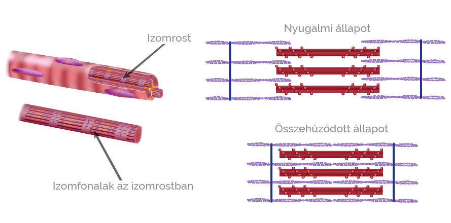 A harántcsíkolt izmok működési egysége a sok sejtmagvú izomrost, amelynek alakja hosszúkás, belsejében rendezett fehérjefonalakból álló rendszer található. Ezek az izomfonalak, amelyek úgy rendeződnek el, mint két kéz, amik, ujjaikkal egymás felé mutatnak, vagy épp a fogaikkal szembefordított fésűk. Az izomrostok összehúzódását az okozza, hogy a szemben álló izomfonalak képesek egymás közé becsúszni. Mivel az egyik végük rögzítve van, az izomfonalak összecsúszásakor maga az izomrost is megrövidül, a rostok rövidülése pedig a teljes izom alakváltozását okozza. Amikor az izom elernyed, az izomfonalak szétcsúsznak eredeti pozíciójukba.