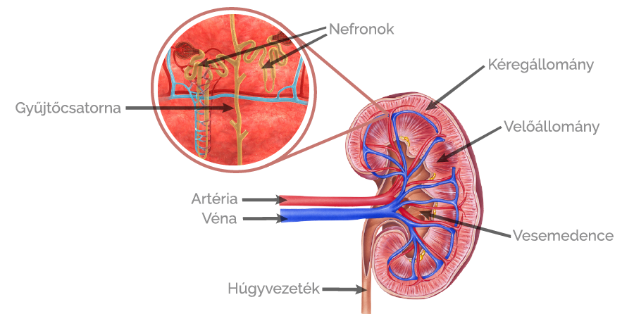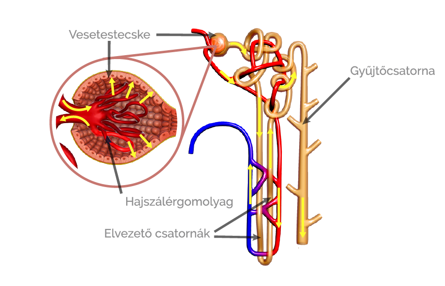 A nefronok első része a vesetestecske. Az ebbe vezető verőér elágazik, hajszálérgomolyagot alkot. A bevezető artéria átmérője nagyobb, mint a kivezető artériáé. A hajszálerekben és a tokban lévő nyomáskülönbség hatására az áramló vérből folyadék szűrődik át a tok üregébe. A hajszálerek falán átszűrődött fehérjementes vérplazma a szűrlet, amely a káros és felesleges anyagok mellett még hasznos molekulákat, például Másik neve glükóz. Egyszerű, hat szénatomos cukor, amely a szénhidrát anyagcsere központi vegyülete, ez a sejtek legfotnosabb energiaforrása.glükózt is tartalmaz. Térfogata 180 liter naponta, amely azt jelenti, hogy túlnyomó része visszaszívódik a vérbe a nefronok elvezető csatornáinak, illetve gyűjtőcsatornáinak területén. Az elvezető csatornák kezdeti szakaszán szívódik vissza a vérbe a glükóz teljes mennyisége és a sók nagy része. Az elvezető csatornák távolabbi szakaszain és a gyűjtőcsatornákban további víz- és sóvisszaszívás történik a szervezet szükségleteinek megfelelően. Emellett a csatorna falában található sejtek kiválasztják a vérből a szervezet számára felesleges anyagokat (pl. gyógyszerek, festékek stb.), majd a gyűjtőcsatornába juttatják. A vizeletté alakuló szűrlet egészséges emberben már csak vizet, sót és nitrogéntartalmú bomlástermékeket (karbamidot, húgysavat) tartalmaz. A gyűjtőcsatornákat elhagyó vizelet térfogata átlagosan 1,5 liter naponta.