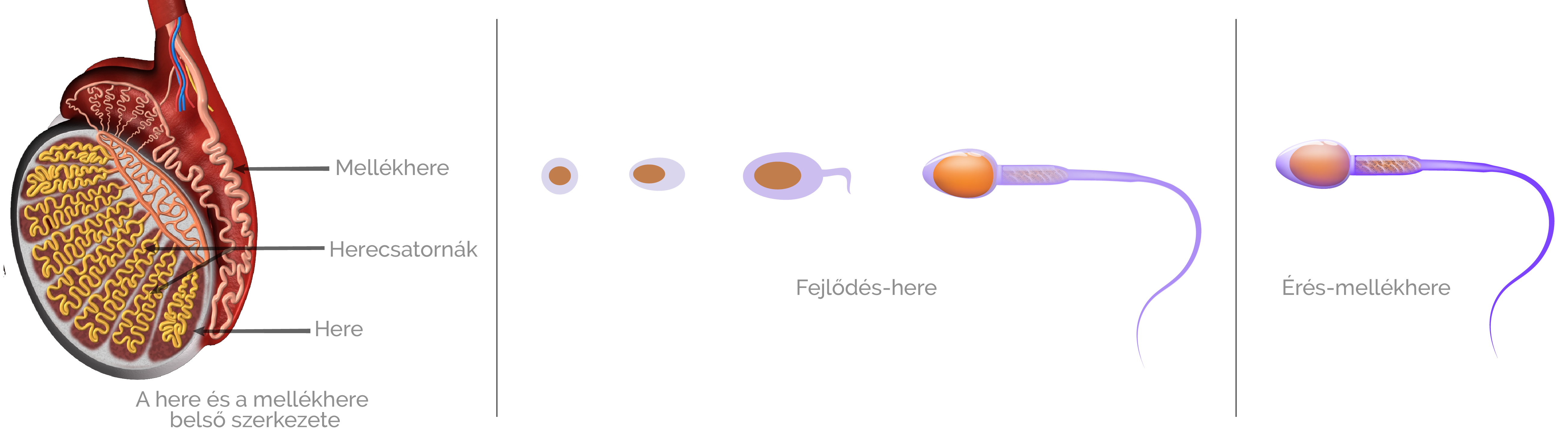 A férfiak ivarmirigye, a here a hasüregen kívül, a herezacskóban helyezkedik el. Belsejében a nemi érést követően folyamatosan képződnek a hímivarsejtek, más néven spermiumok. A here egyes sejtjei A here kötőszöveti sejtjeiben képződő hormon. Fokozza a hím ivarsejtek képződését, részt vesz a férfias testalkat és a pszichés-magatartási jellemzők kialakításában.tesztoszteron nevű hormont termelnek. A heréből a hímivarsejtek a mellékherébe jutnak, ahol további érési folyamatokon mennek keresztül. Nemi izgalom hatására a spermiumok a mellékheréből az izmos falú ondóvezetékbe jutnak. Az ondóvezetékbe nyílik két mirigy, az ondóhólyag és a prosztata kivezető csöve. Az ondóhólyag váladéka cukrot tartalmaz, ez táplálja a hímivarsejteket. A prosztata lúgos váladékot termel, amely a hímivarsejtek életben maradásához szükséges. A két mirigy váladéka a hímivarsejtekkel keveredve alkotja az ondót. Az ondó magömléskor az ondóvezetékből a hímvessző tengelyében húzódó húgycsövön keresztül távozik a szervezetből.