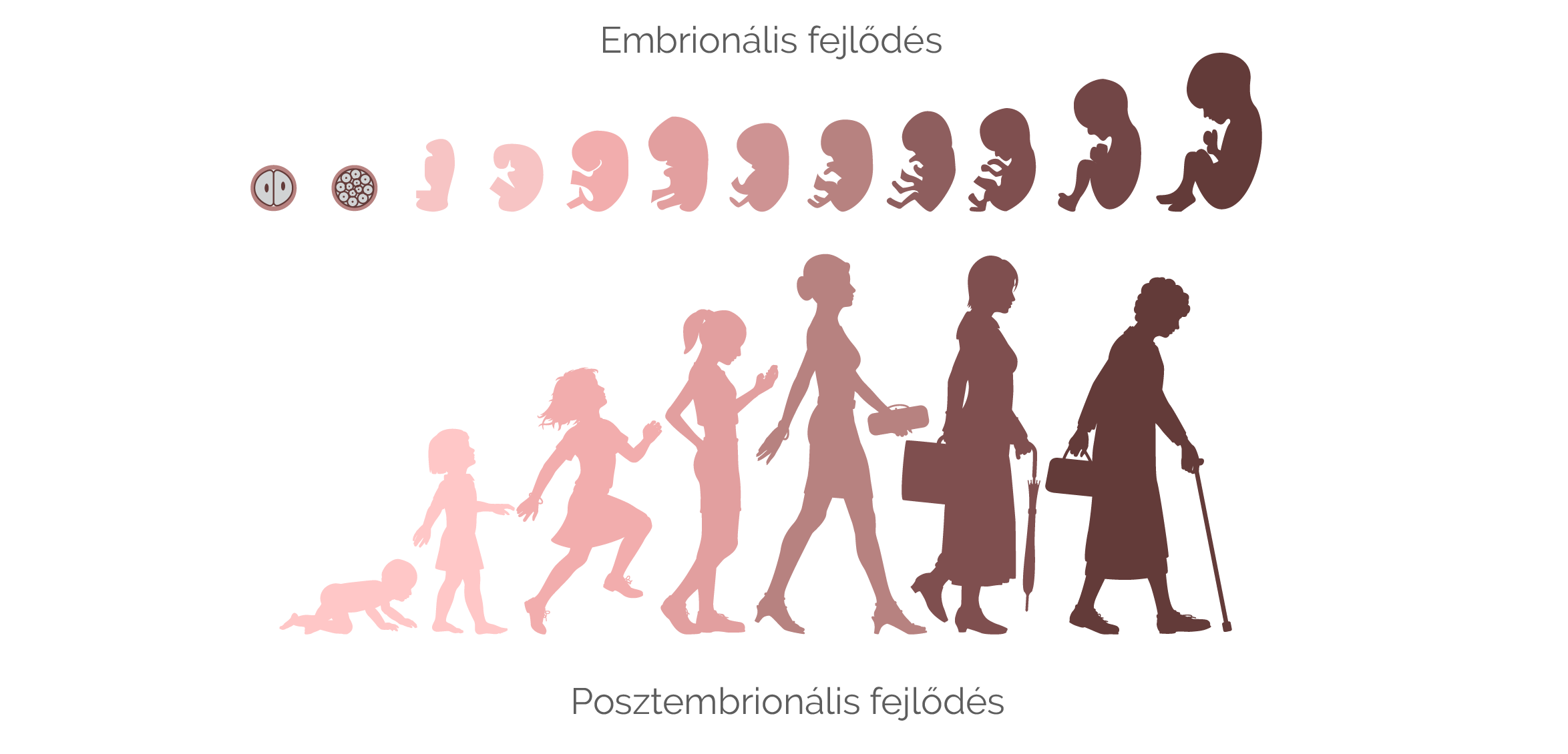 Az új egyed első sejtje a megtermékenyítés során alakul ki. A megtermékenyített petesejt gyorsan osztódásnak indul, ezzel megkezdődik az Az egyedfejlődésnek az a szakasza, ami a megtermékenyítéstől a születésig tart.embrionális fejlődés. A fejlődő A megtermékenyítéstől az embrionális fejlődés harmadik hónapjáig így nevezik a fejlődő utódot. Ezután már a magzat nevet viseli.embrió a petevezeték Olyan sejtalkotó, amely egysejtűeknél a sejt mozgását teszi lehetővé, míg a csillós hámokon a szövet felületén lévő anyagok, sejtek továbbítása a feladata. A sejt felszínén elhelyezkedő csillók rövid, szőrszerű képződmények és mindig sok van belőlük, mozgásuk összehangolt.csillóinak segítségével jut el a méhbe, ahol kezdetben a méhnyálkahártya látja el tápanyagokkal és oxigénnel, majd pár hónappal később kialakul a méhlepény. A méhen belüli fejlődés mintegy 9 hónapon (280 napon) át tart. A terhesség végén az érett A metermékenyítést követő kb. harmadik hónaptól így nevezzük a fejlődő egyedet.magzatból felszabaduló hormonok hatására beindul a szülés. A csecsemő világrajövetelével kezdetét veszi a Az egyedfejlődésnek az a szakasza, ami a születéstől a halálig tart.posztembrionális fejlődés.